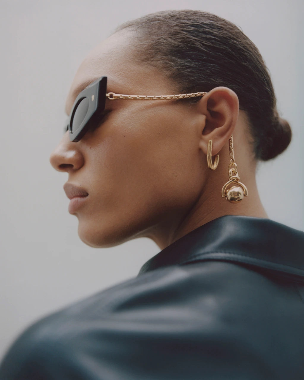 Cat-eye, square, D-Frame and oval frames are all updated with expressive touches that are recognisably Nanushka: from intricate gold-tone arms to angular cutouts that present a unique set of proportions and dimensions.