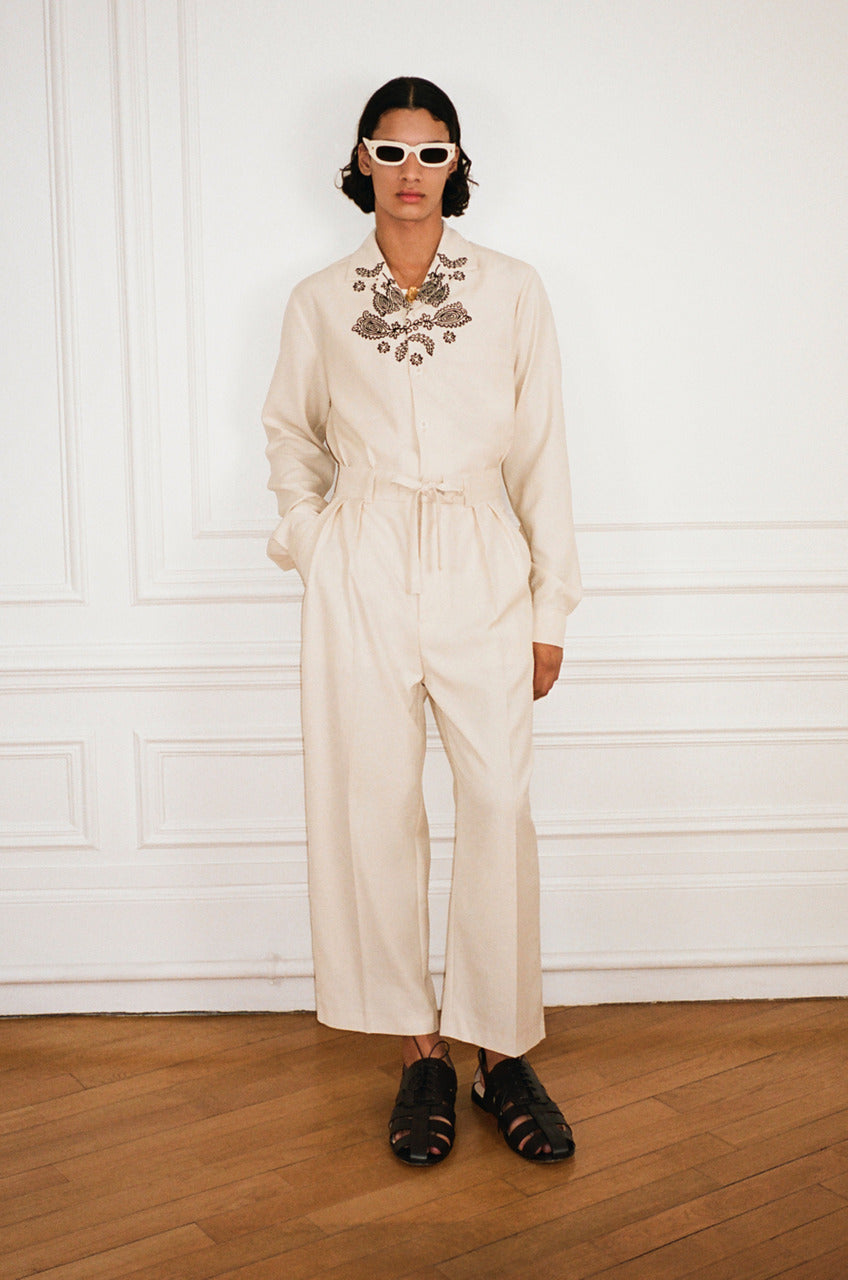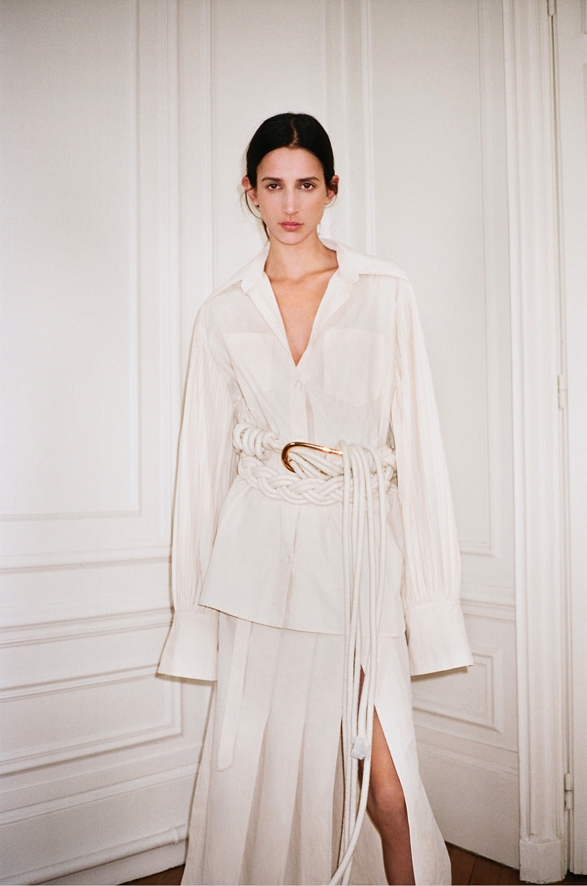 Combining traditional technique and contemporary materials, crafty pebble merrow stitching distinguishes signature vegan leather separates. Trailing macrame ties add a sense of heft and structure to whisper-weight slip satin silhouettes. Cut-out shapes, intricate embroidery and patchworks of upcycled organic cotton are inspired by traditional Hungarian tablecloths, reworked with refined modernity.
