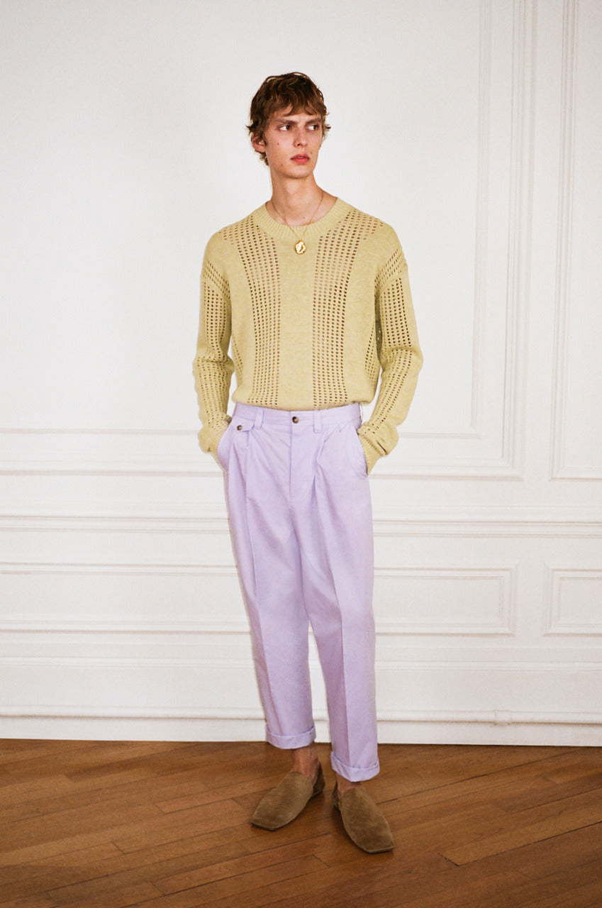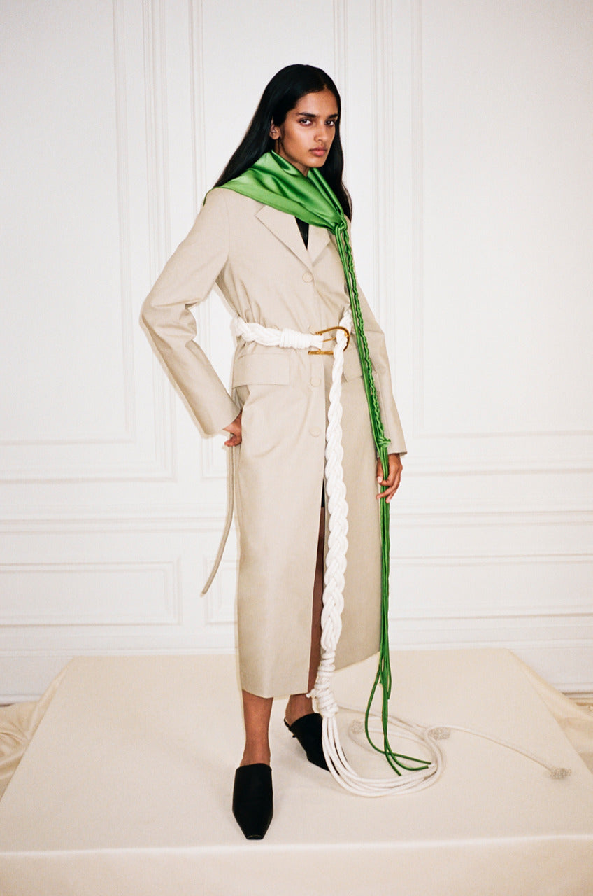 For Spring/Summer 2022, single looks are made up of a multitude of layers, both literally and figuratively. Elevated materials, sensual silhouettes and traditional technique explore ideas of aesthetic modernity, functionality, luxury and responsibility. Bold colors run through the collection, hinting at a return to the joy of dressing. Green, blue and lilac satin are used poignantly at just the collar or cuffs.