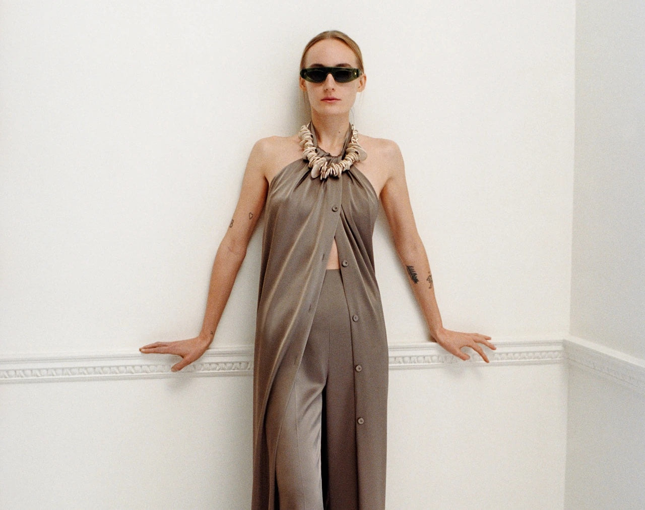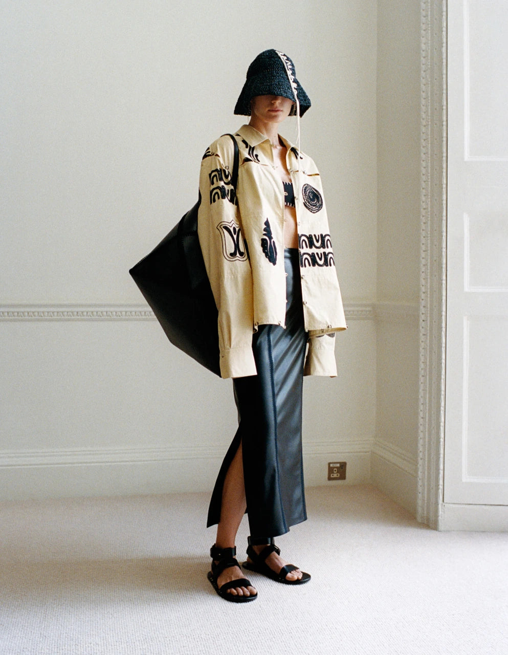 The presence of the atelier is felt in every Nanushka piece within theSpring/Summer 2023 collection. Titled Spirit and Matter, the newseason illustrates the physical process of craft and design; handcrafted elements co-exist with technical fabrics across the collection, exploring the interconnectivity of beauty and function. Nanushka’s intuitive and organic design approach leaves room for unintentional results such as distorted prints caused by draping, and new silhouettes created by versatile tying techniques.